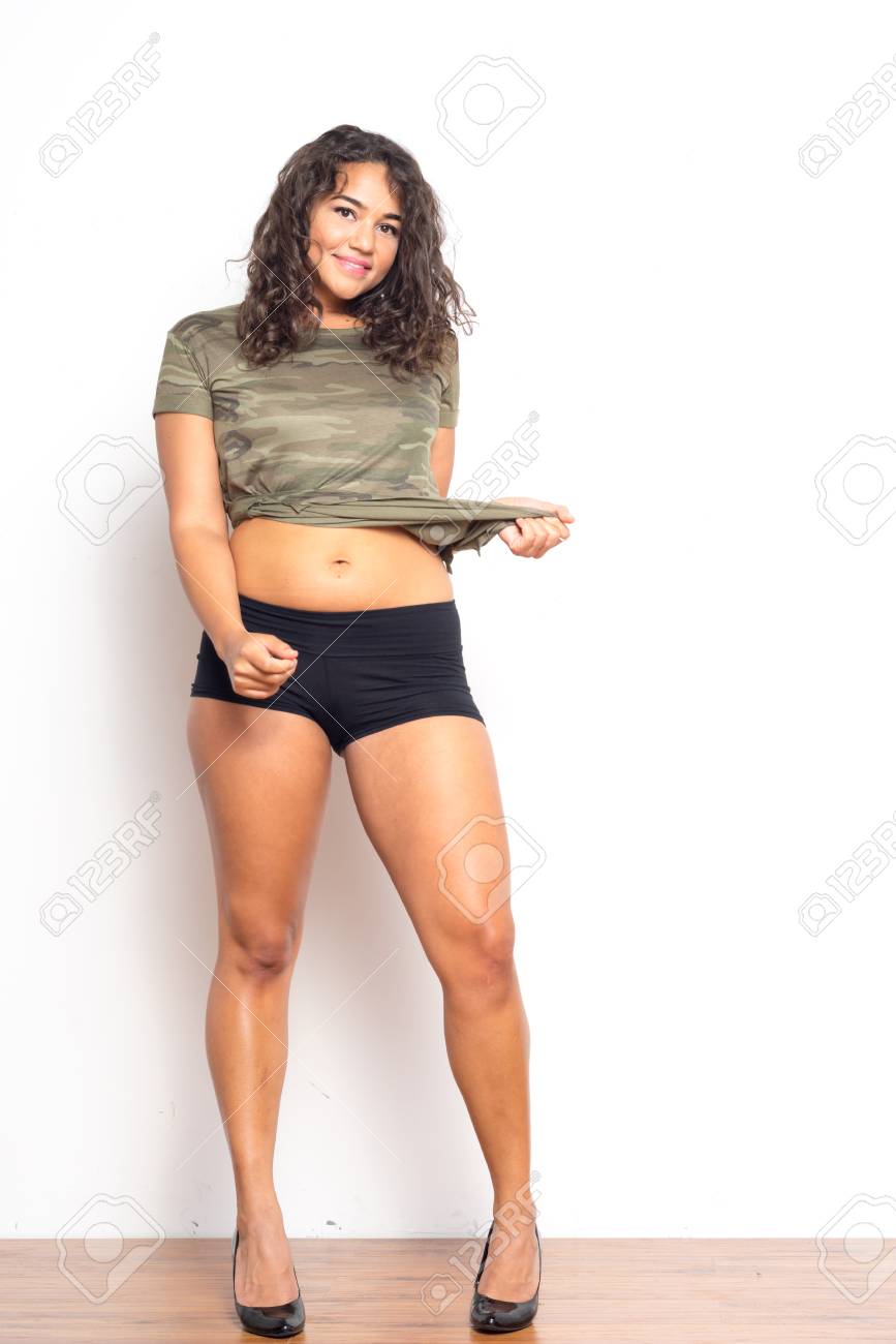 白い T シャツとデニムのショート パンツでブルネットの女性の完全な長さ 分離されました の写真素材 画像素材 Image 41434182