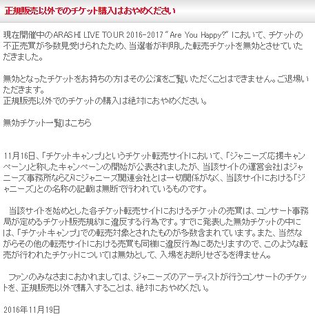 ジャニーズ事務所 公式サイトでチケット転売者を晒す オークション等出品による当選取消し一覧 を掲載し無効扱い 2ちゃんまとめ