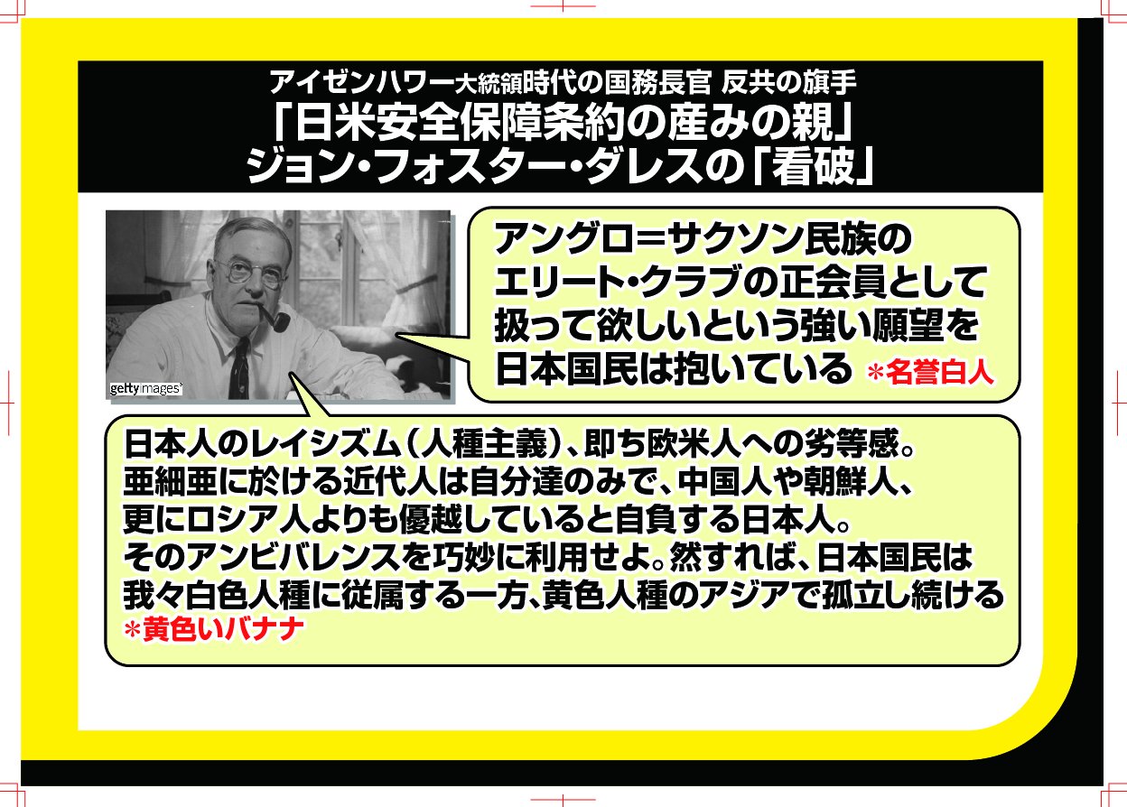 日米安保の生みの親 ジョン フォスター ダレス 日本におけるレイシズムは 欧米への 劣等感 の一方で アジアで最も優越しているとの 自惚れ が生み出している この屈折した感情を利用せよ ゆるねとにゅーす